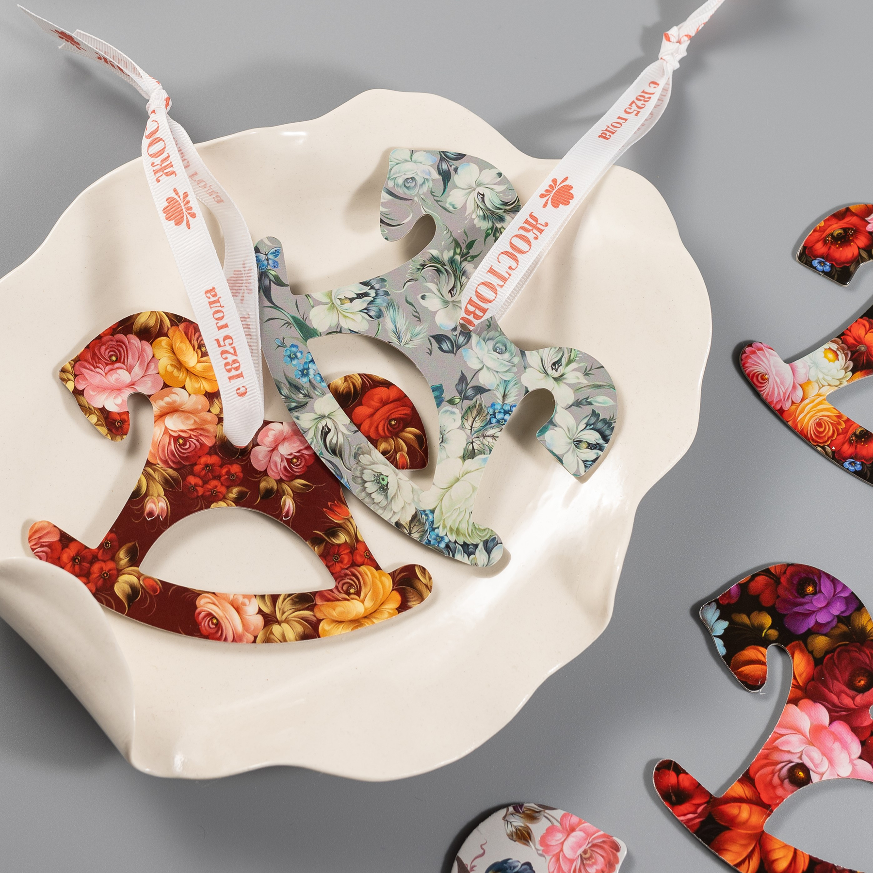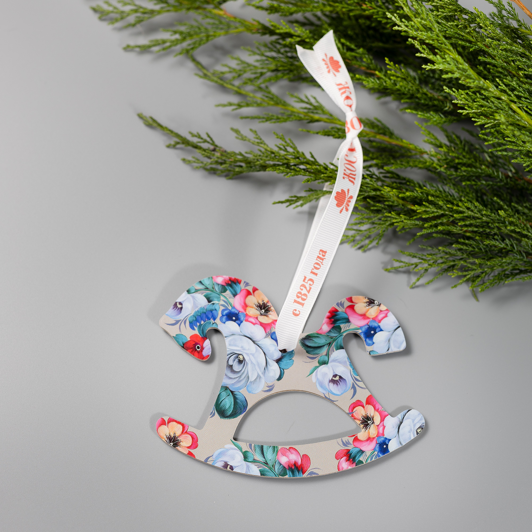 Форма лошадки — символ 2026 года, а жостовские цветы добавляют образу тепла, цвета и узнаваемой эстетики. Ленты с фирменной символикой позволяют удобно разместить игрушки на ёлке, в новогодней композиции или использовать их для декора интерьера.