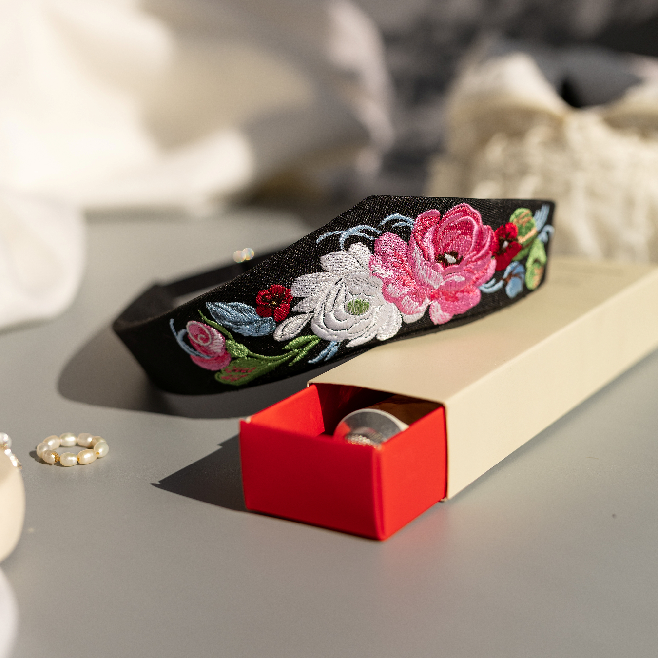 На поверхности — изящная цветочная композиция, вдохновлённая жостовской росписью. Яркие акценты на чёрном фоне создают выразительный, но при этом элегантный образ.