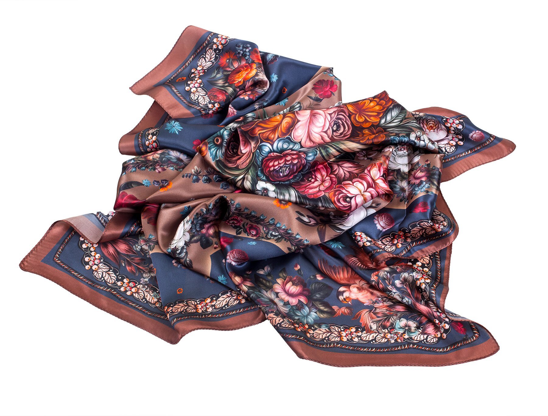 Шёлковый платок с жостовскими цветами. Изготовлен по заказу ООО «Жостовская фабрика декоративной росписи» на ОАО «Павловопосадская платочная мануфактура