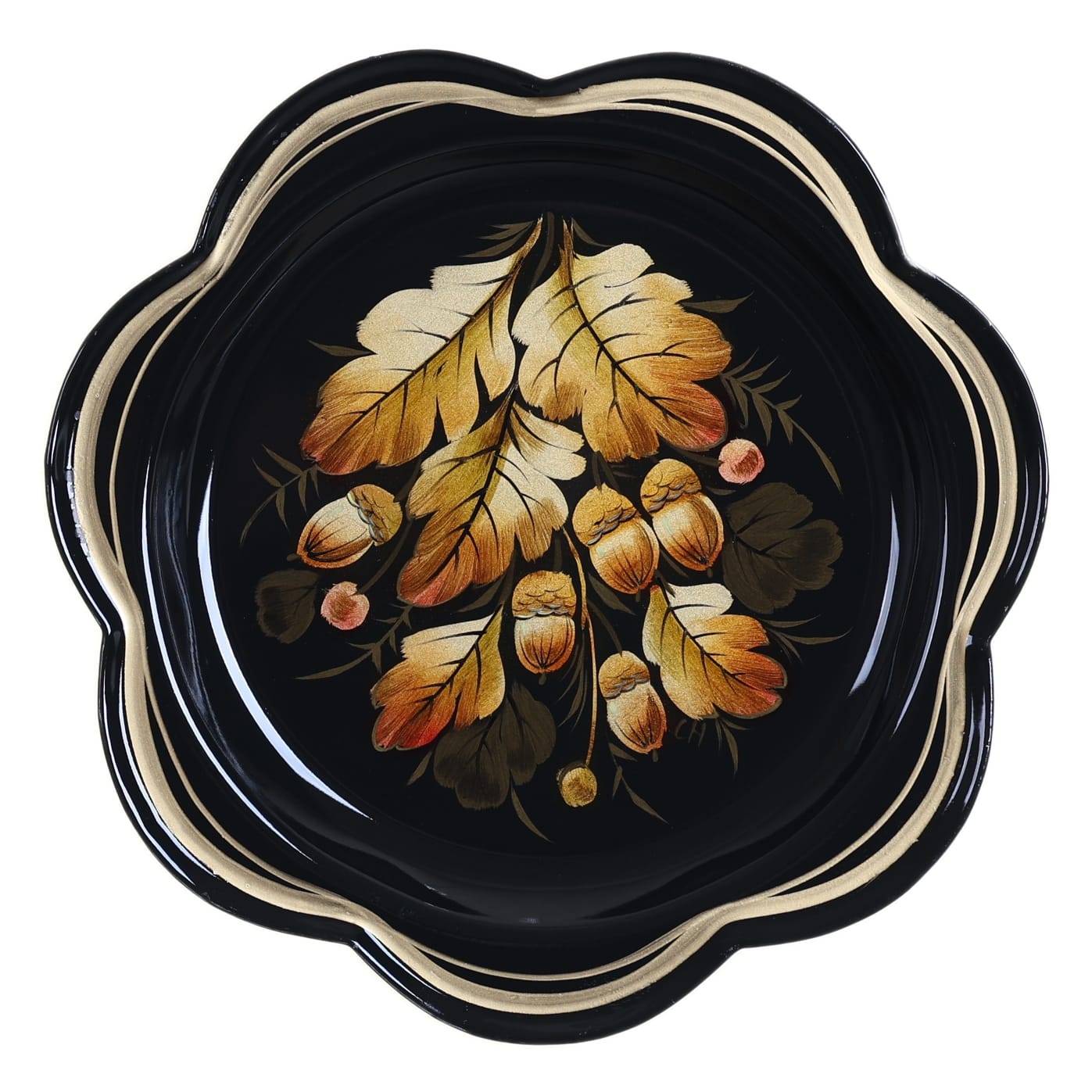 Жостовский поднос A1D290126163, Автор Соколова Наталья, Материал: Металл, Форма Ромашка, Фон Черный, Сюжет Орехи, Размер 18 см, Вес 0.15 кг, В комплекте: Фирменный полиэтиленовый пакет, Производитель: Жостовская фабрика декоративной росписи