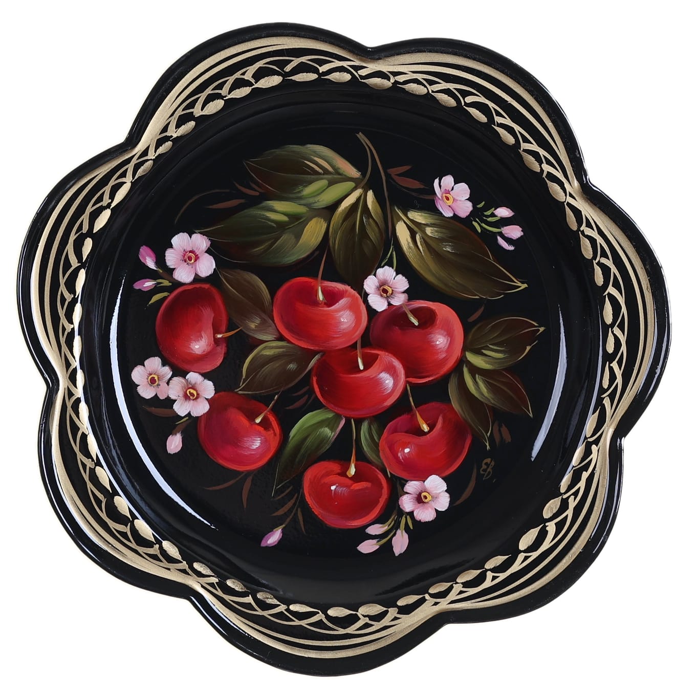 Жостовский поднос A1D02032627, Автор Васильева Екатерина, Материал: Металл, Форма Ромашка, Фон Черный, Сюжет Ягоды, Размер 18 см, Вес 0.15 кг, В комплекте: Фирменный полиэтиленовый пакет, Производитель: Жостовская фабрика декоративной росписи