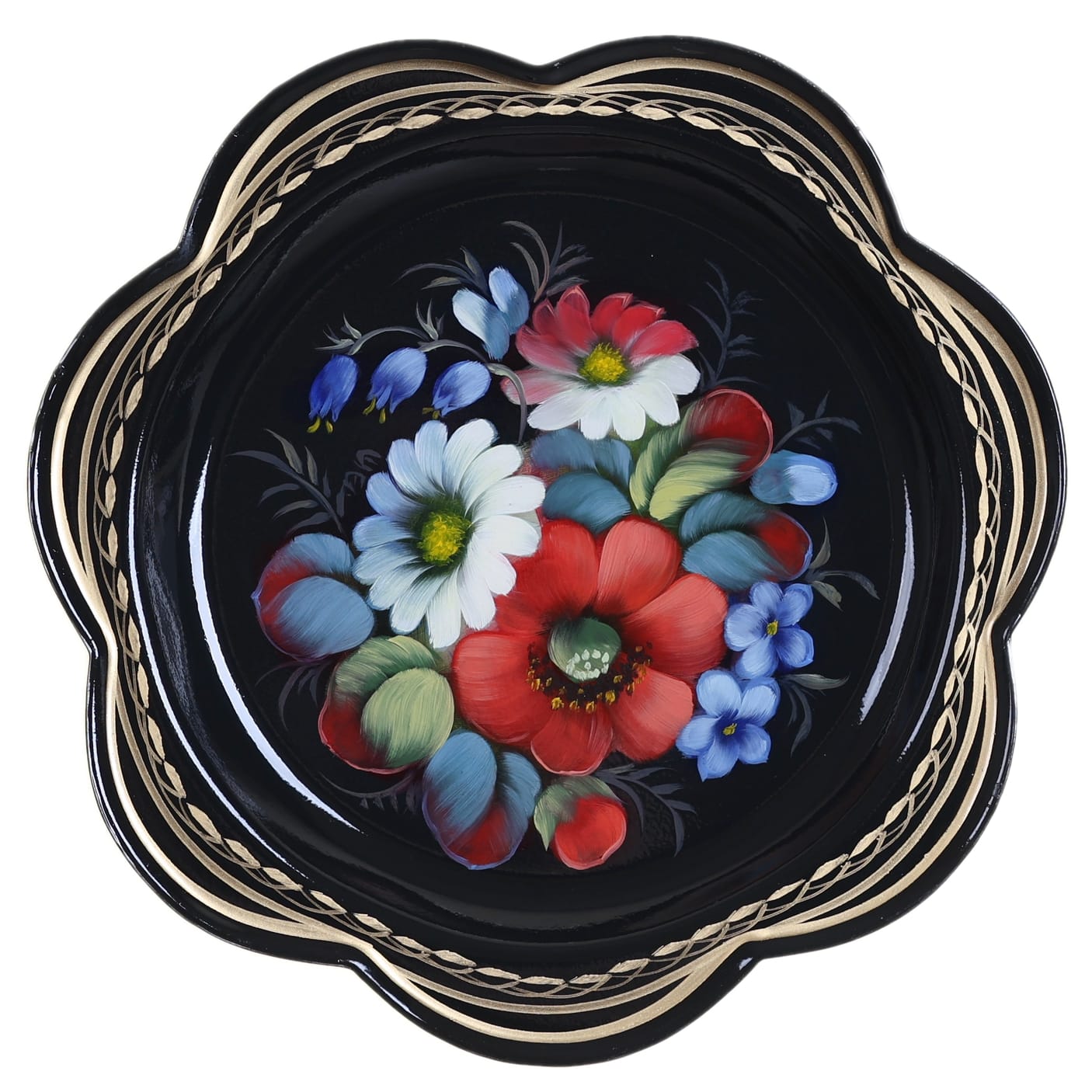 Жостовский поднос A1D02032619, Автор Шенелева Екатерина, Материал: Металл, Форма Ромашка, Фон Черный, Сюжет Цветы, Размер 18 см, Вес 0.15 кг, В комплекте: Фирменный полиэтиленовый пакет, Производитель: Жостовская фабрика декоративной росписи