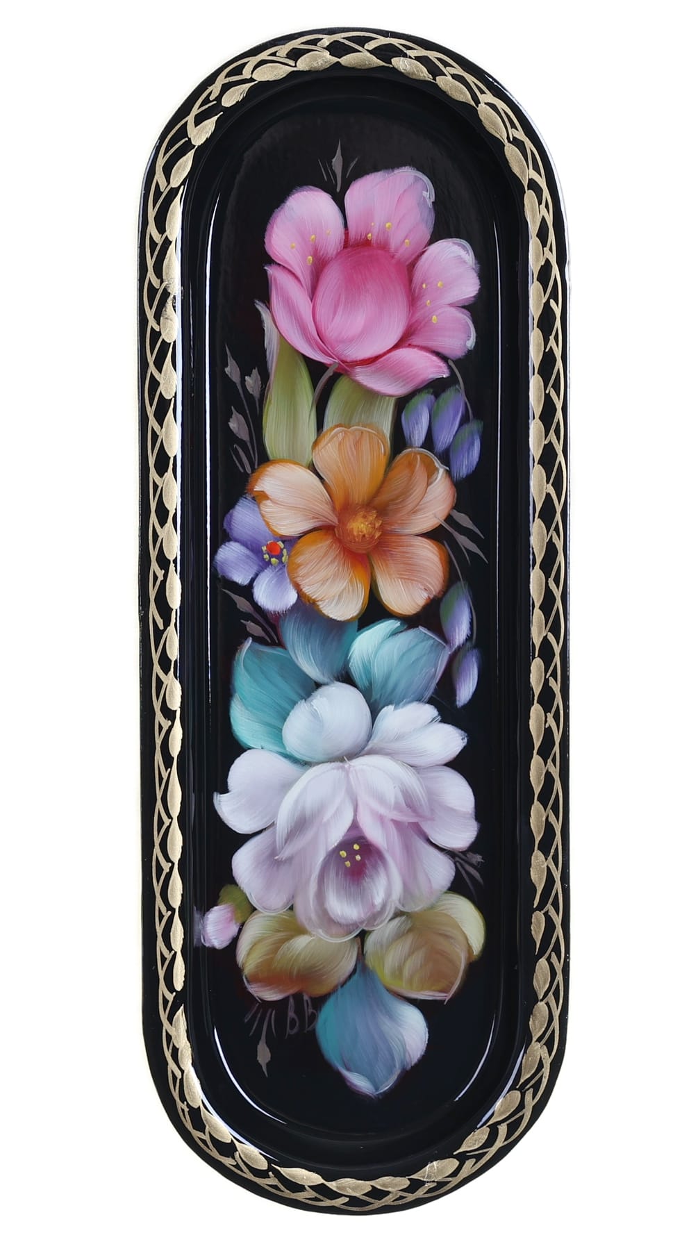Жостовский поднос A4D020326283, Автор Владыкина Вера, Материал: Металл, Форма Карандашница, Фон Черный, Сюжет Цветы, Размер 21х8 см, Вес 0.1 кг, В комплекте: Фирменный полиэтиленовый пакет, Производитель: Жостовская фабрика декоративной росписи