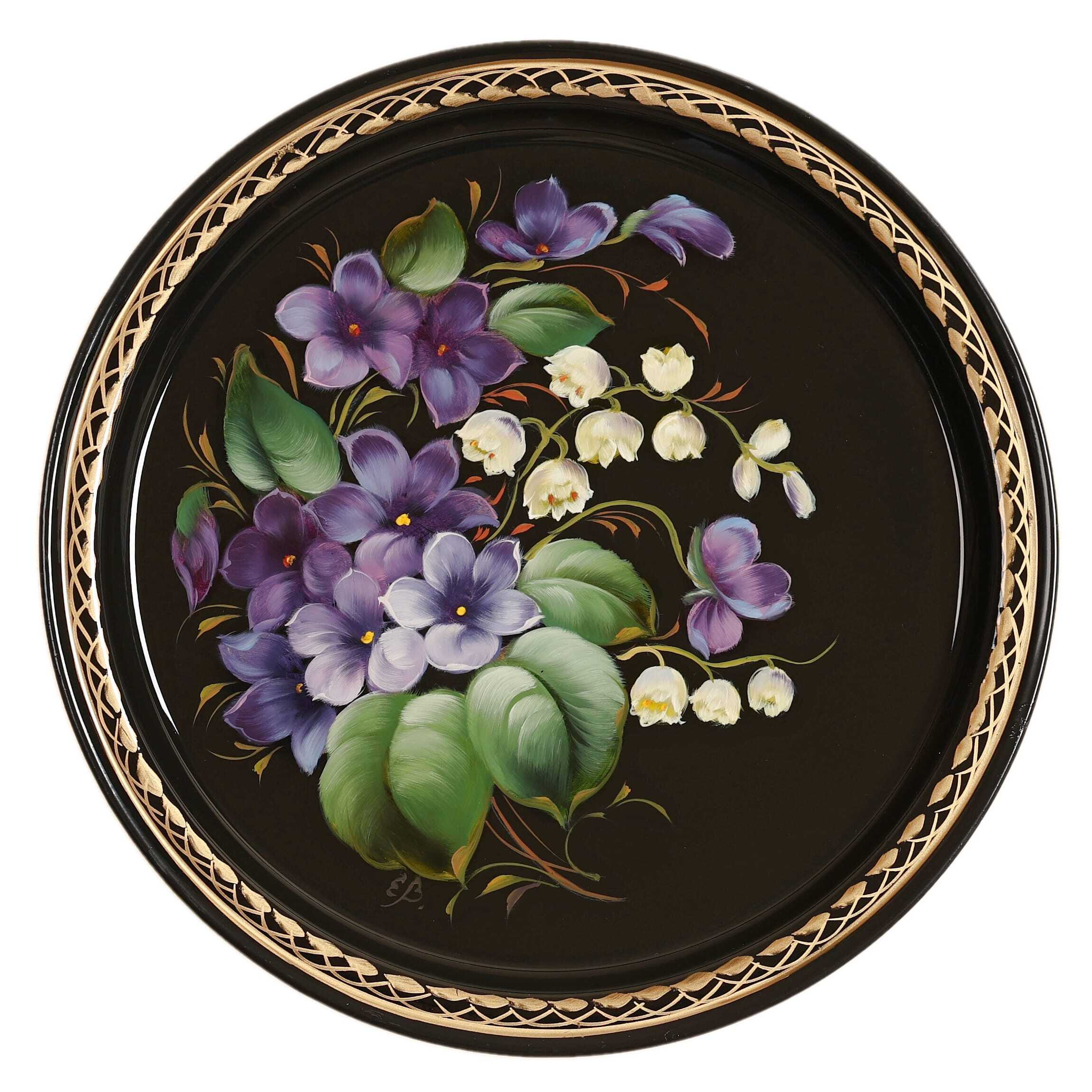 Жостовский поднос A5D290925240, Автор Васильева Екатерина, Материал: Металл, Форма Круглая, Фон Черный, Сюжет Цветы, Размер 22 см, Вес 0.2 кг, В комплекте: Фирменный полиэтиленовый пакет, Производитель: Жостовская фабрика декоративной росписи