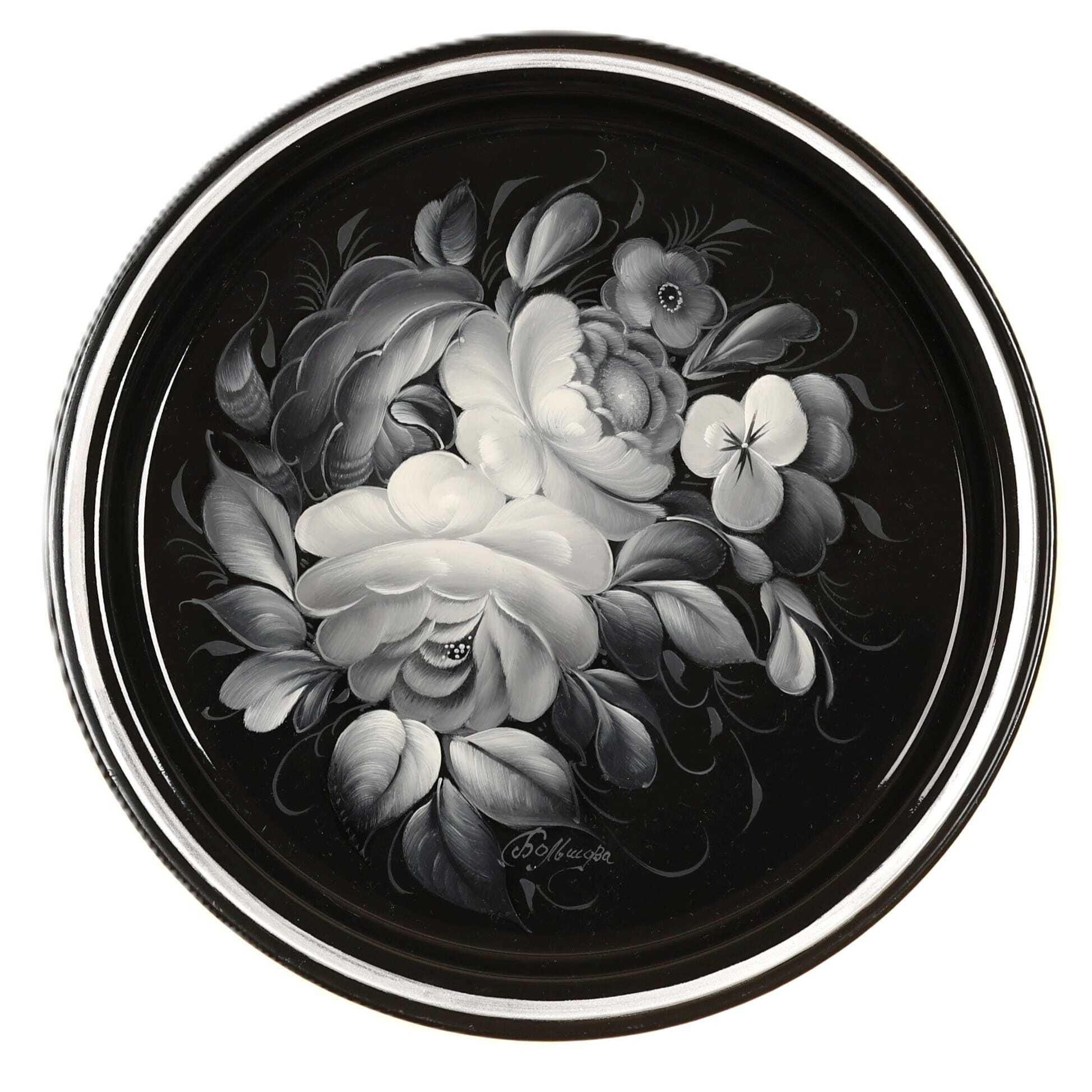 Жостовский поднос A5D271125202, Автор Большова Нина, Материал: Металл, Форма Круглая, Фон Черный, Сюжет Цветы, Размер 22 см, Вес 0.2 кг, В комплекте: Фирменный полиэтиленовый пакет, Производитель: Жостовская фабрика декоративной росписи