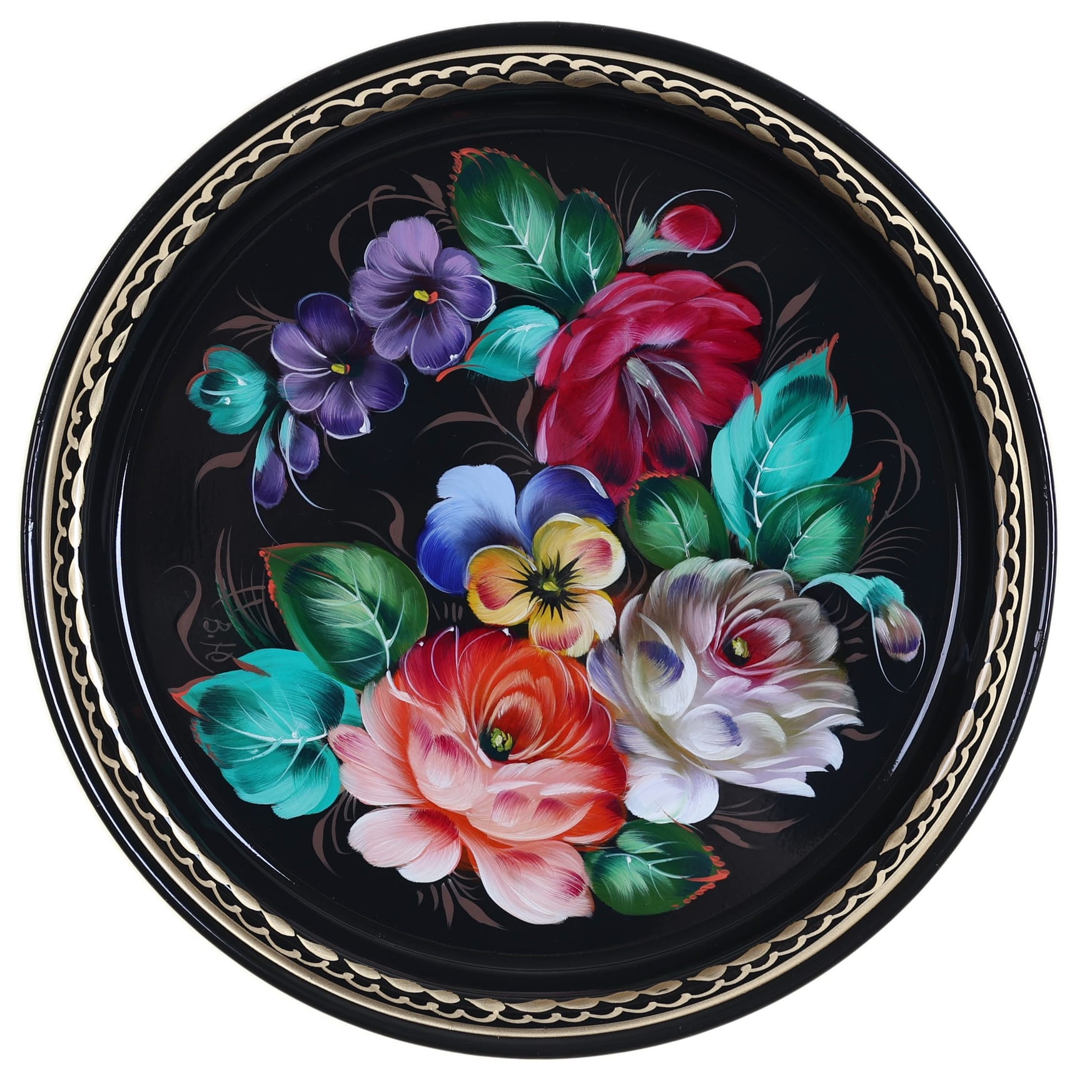 Жостовский поднос A5D020326323, Автор Юрасов Виталий, Материал: Металл, Форма Круглая, Фон Черный, Сюжет Цветы, Размер 22 см, Вес 0.2 кг, В комплекте: Фирменный полиэтиленовый пакет, Производитель: Жостовская фабрика декоративной росписи