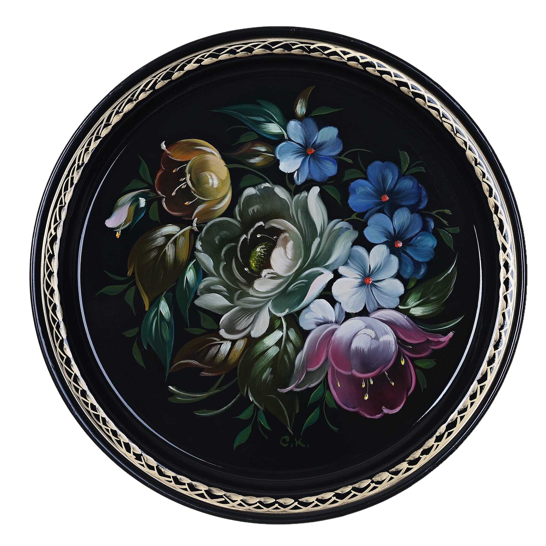 Жостовский поднос A5D021124232, Автор Салтыкова Ксения, Материал: Металл, Форма Круглая, Фон Черный, Сюжет Цветы, Размер 22 см, Вес 0.2 кг, В комплекте: Фирменный полиэтиленовый пакет, Производитель: Жостовская фабрика декоративной росписи
