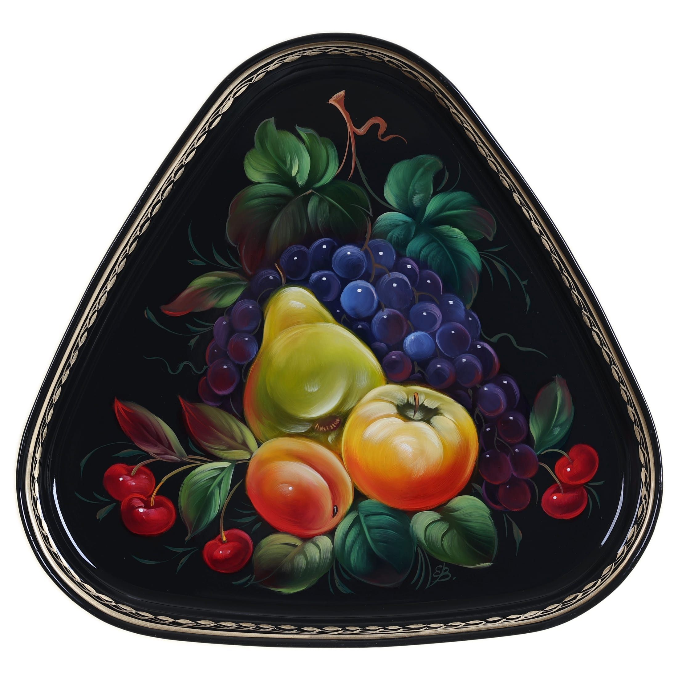 Жостовский поднос A8D020326364, Автор Васильева Екатерина, Материал: Металл, Форма Треугольная, Фон Черный, Сюжет Фрукты, Размер 29х29 см, Вес 0.4 кг, В комплекте: Фирменный полиэтиленовый пакет, Производитель: Жостовская фабрика декоративной росписи