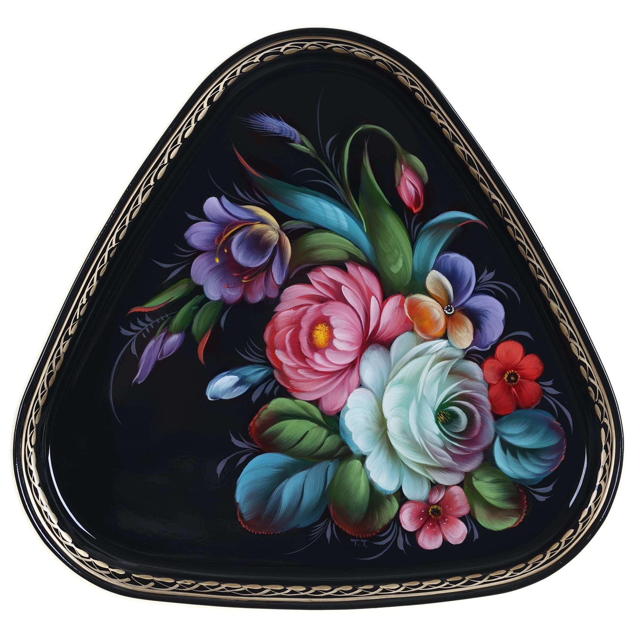 Жостовский поднос A8D020326365, Автор Тихомирова Тамара, Материал: Металл, Форма Треугольная, Фон Черный, Сюжет Цветы, Размер 29х29 см, Вес 0.4 кг, В комплекте: Фирменный полиэтиленовый пакет, Производитель: Жостовская фабрика декоративной росписи