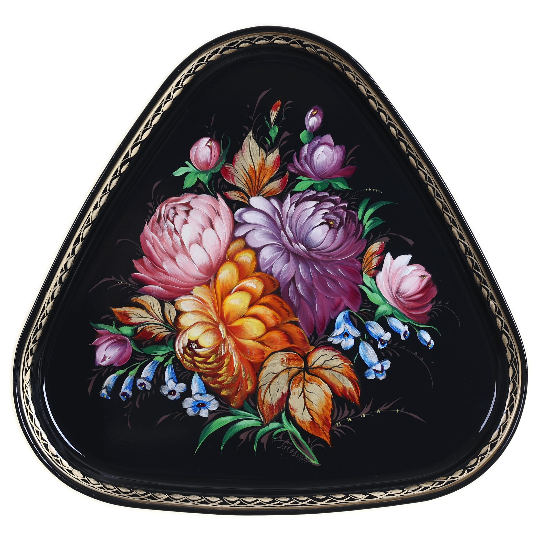 Жостовский поднос A8D020326360, Автор Головина Екатерина, Материал: Металл, Форма Треугольная, Фон Черный, Сюжет Цветы, Размер 29х29 см, Вес 0.4 кг, В комплекте: Фирменный полиэтиленовый пакет, Производитель: Жостовская фабрика декоративной росписи