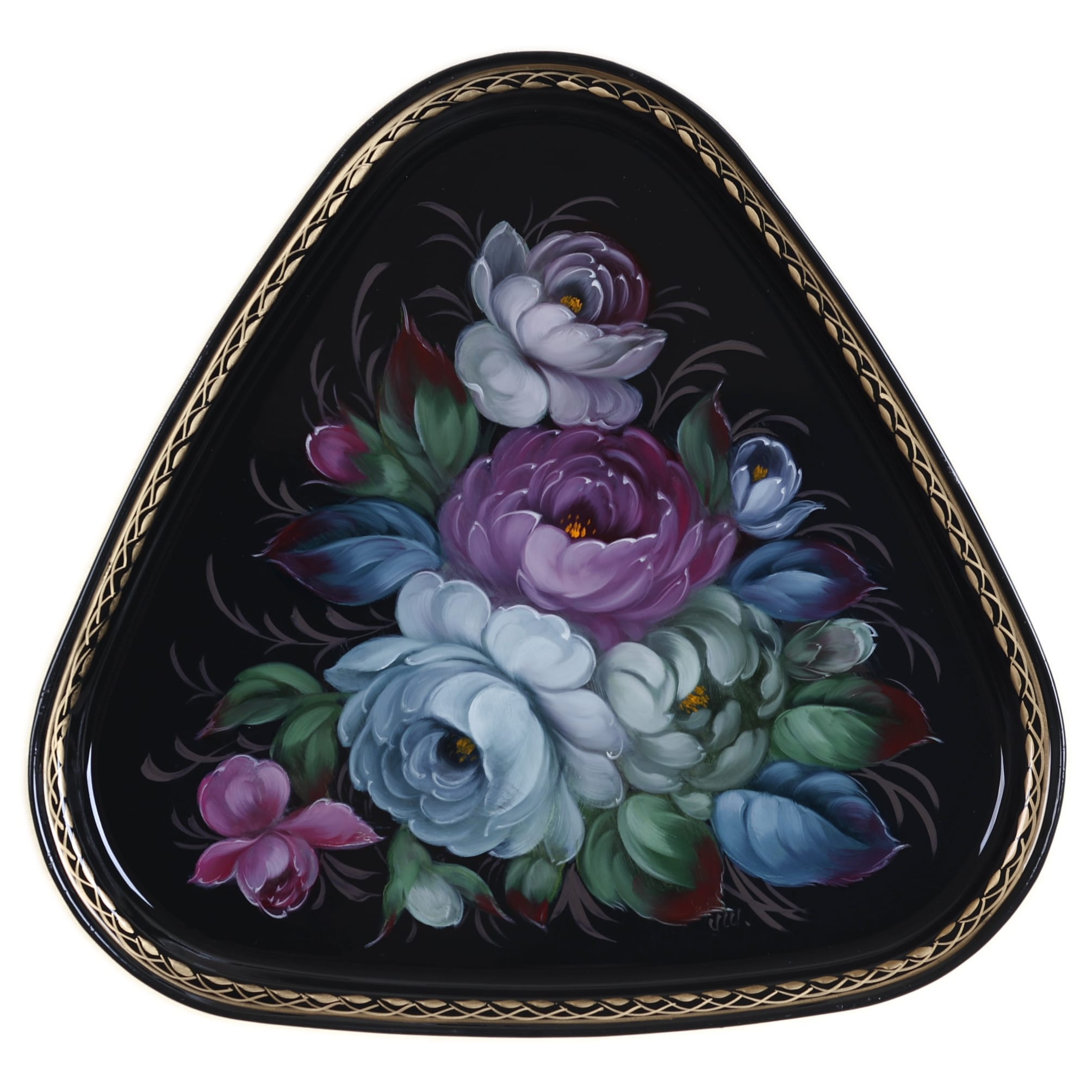 Жостовский поднос A8D020326357, Автор Шиин Ирина, Материал: Металл, Форма Треугольная, Фон Черный, Сюжет Цветы, Размер 29х29 см, Вес 0.4 кг, В комплекте: Фирменный полиэтиленовый пакет, Производитель: Жостовская фабрика декоративной росписи