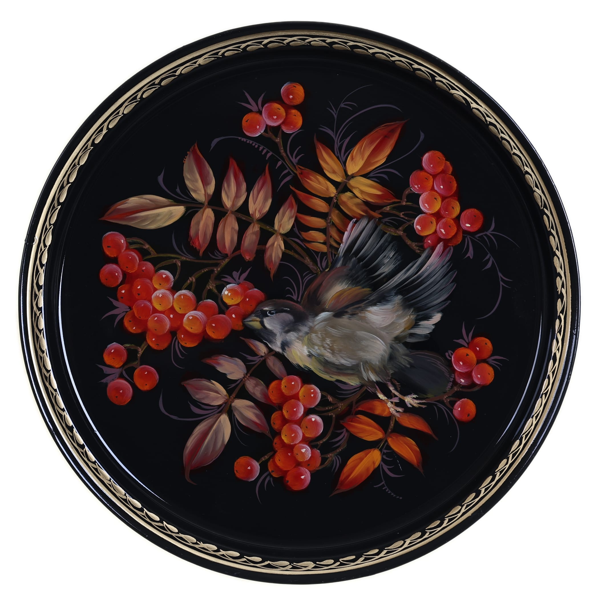 Жостовский поднос A9D29012659, Автор Семенычева Лиля, Материал: Металл, Форма Круглая, Фон Черный, Сюжет Рябина##Птицы, Размер 30 см, Вес 0.3 кг, В комплекте: Фирменный полиэтиленовый пакет, Производитель: Жостовская фабрика декоративной росписи