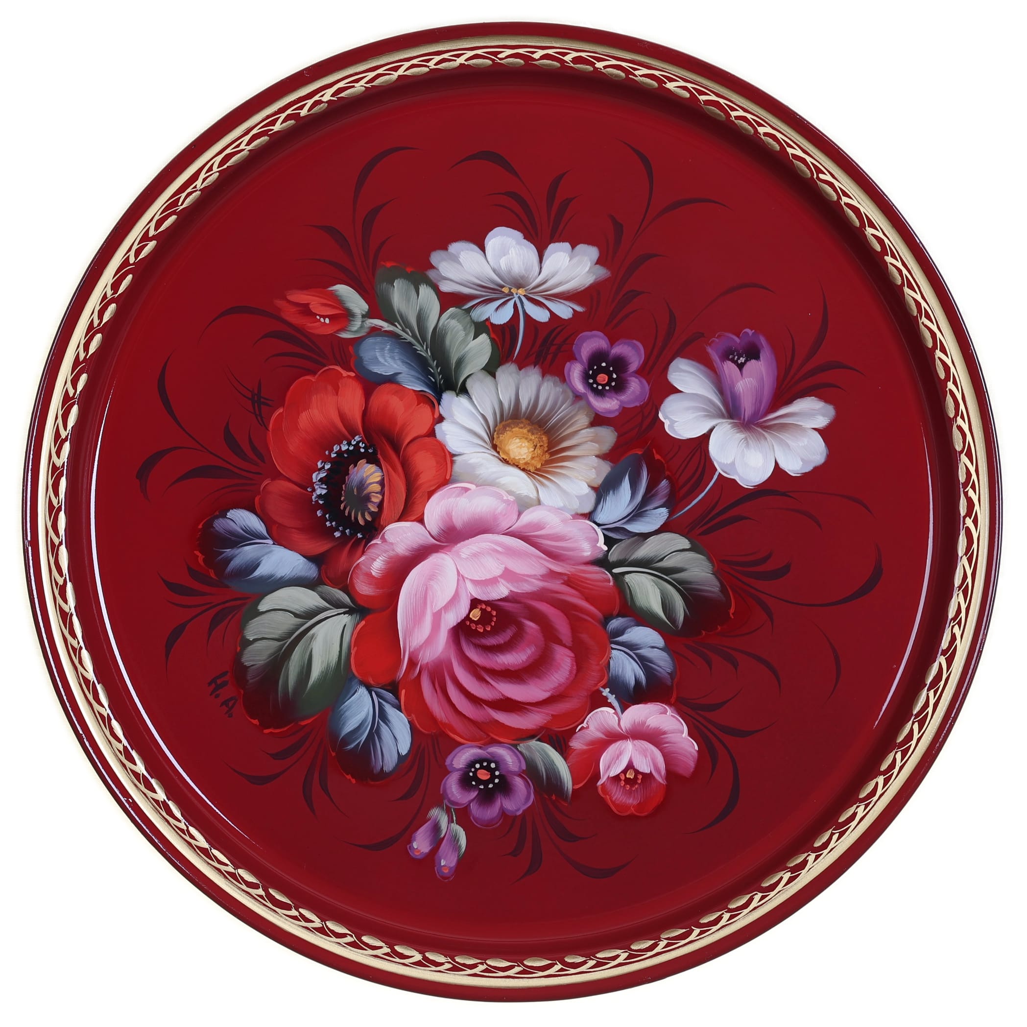 Жостовский поднос A9D020326398, Автор Никонова Арина, Материал: Металл, Форма Круглая, Фон Цветной, Сюжет Цветы, Размер 30 см, Вес 0.3 кг, В комплекте: Фирменный полиэтиленовый пакет, Производитель: Жостовская фабрика декоративной росписи