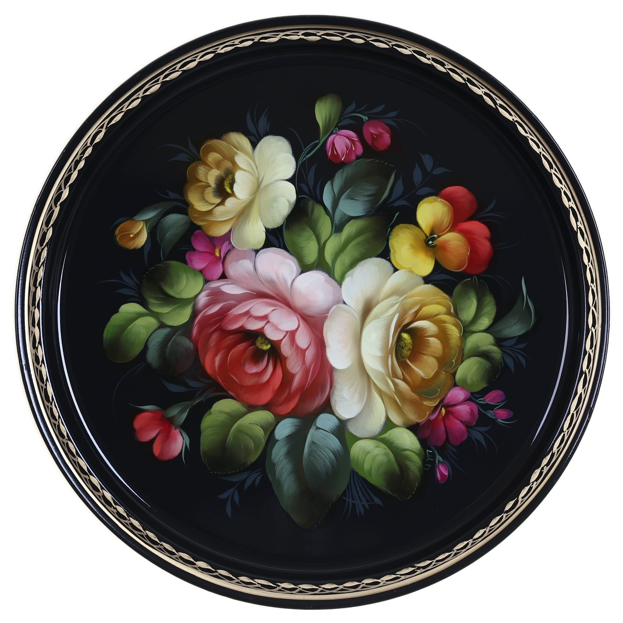Жостовский поднос A9D020326388, Автор Савина Татьяна, Материал: Металл, Форма Круглая, Фон Черный, Сюжет Цветы, Размер 30 см, Вес 0.3 кг, В комплекте: Фирменный полиэтиленовый пакет, Производитель: Жостовская фабрика декоративной росписи