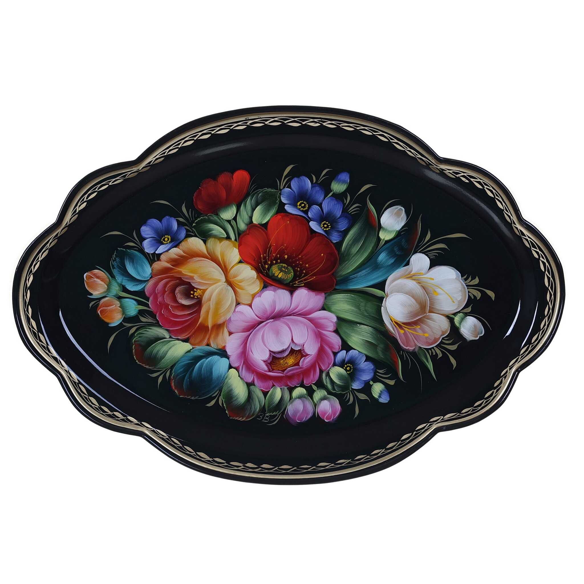 Жостовский поднос A11D17122425, Автор Зайцева Валентина, Материал: Металл, Форма Фигурная, Фон Черный, Сюжет Цветы, Размер 32х22 см, Вес 0.35 кг, В комплекте: Фирменный полиэтиленовый пакет, Производитель: Жостовская фабрика декоративной росписи