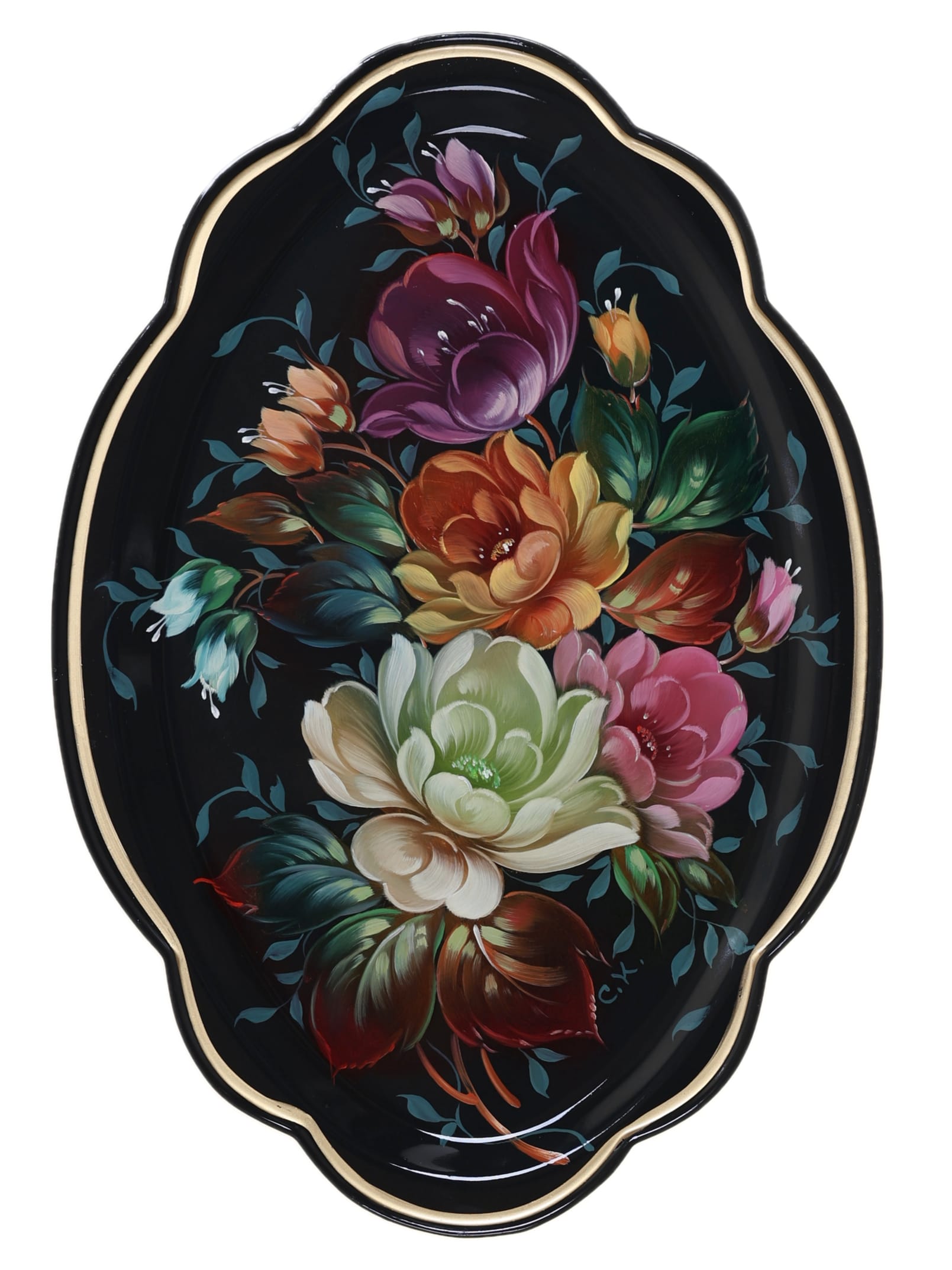 Жостовский поднос A11D02032645, Автор Салтыкова Ксения, Материал: Металл, Форма Фигурная, Фон Черный, Сюжет Цветы, Размер 32х22 см, Вес 0.35 кг, В комплекте: Фирменный полиэтиленовый пакет, Производитель: Жостовская фабрика декоративной росписи