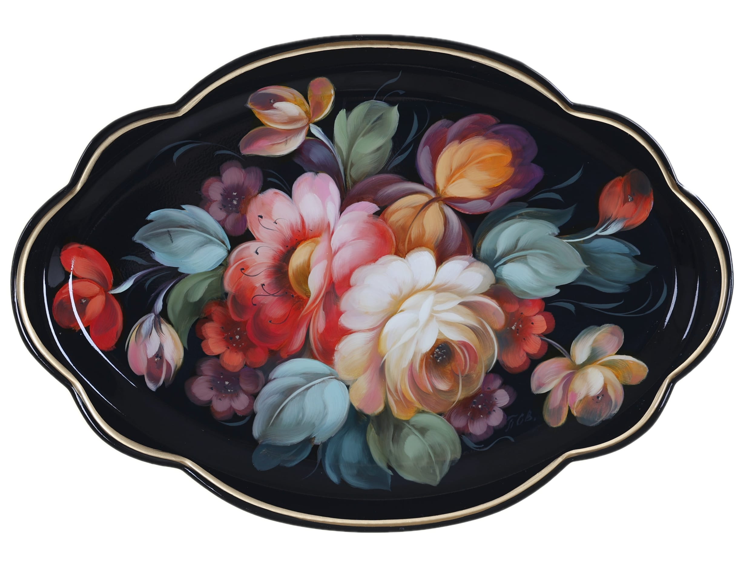 Жостовский поднос A11D02032664, Автор Плищенко Сергей, Материал: Металл, Форма Фигурная, Фон Черный, Сюжет Цветы, Размер 32х22 см, Вес 0.35 кг, В комплекте: Фирменный полиэтиленовый пакет, Производитель: Жостовская фабрика декоративной росписи
