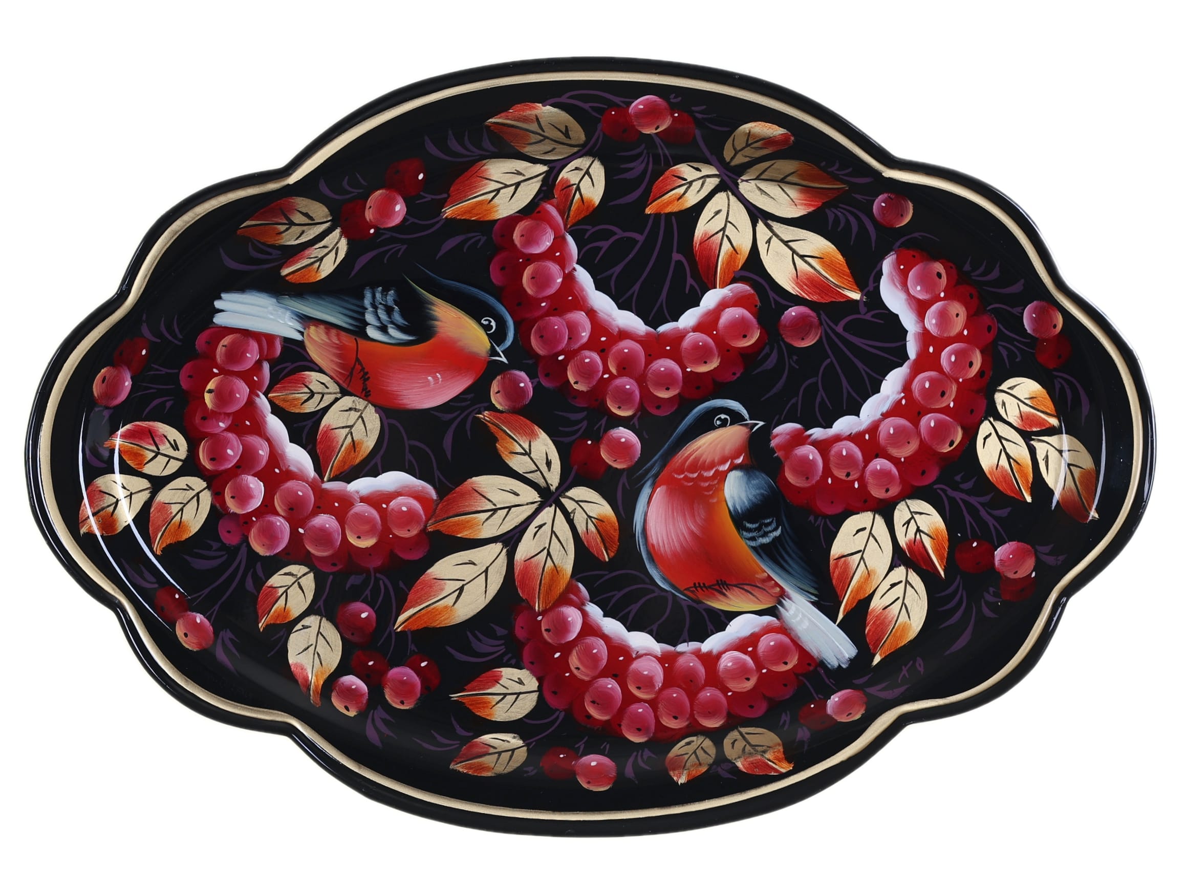 Жостовский поднос A11D02032658, Автор Хитрова Ольга, Материал: Металл, Форма Фигурная, Фон Черный, Сюжет Рябина##Птицы, Размер 32х22 см, Вес 0.35 кг, В комплекте: Фирменный полиэтиленовый пакет, Производитель: Жостовская фабрика декоративной росписи