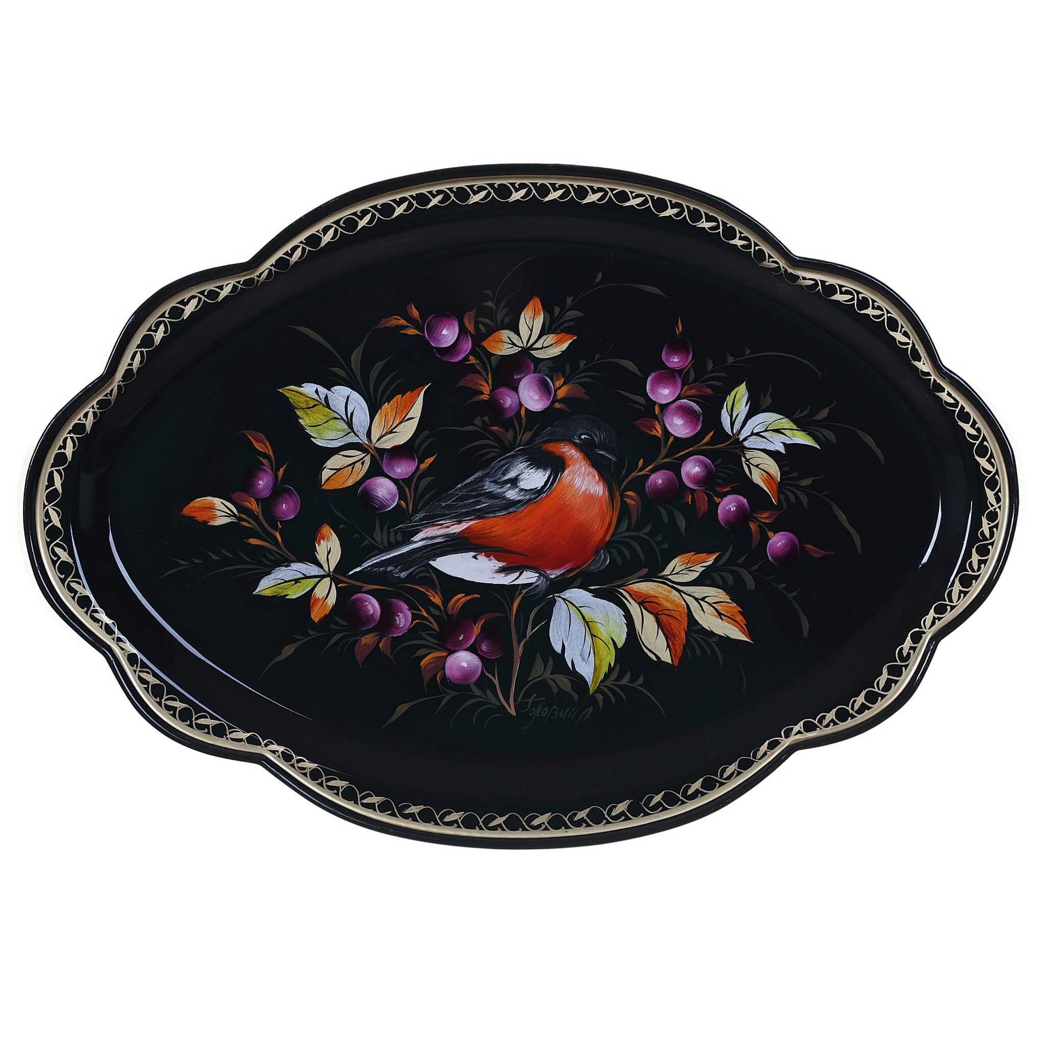Жостовский поднос A11D17122431, Автор Головина Екатерина, Материал: Металл, Форма Фигурная, Фон Черный, Сюжет Птицы, Размер 32х22 см, Вес 0.35 кг, В комплекте: Фирменный полиэтиленовый пакет, Производитель: Жостовская фабрика декоративной росписи