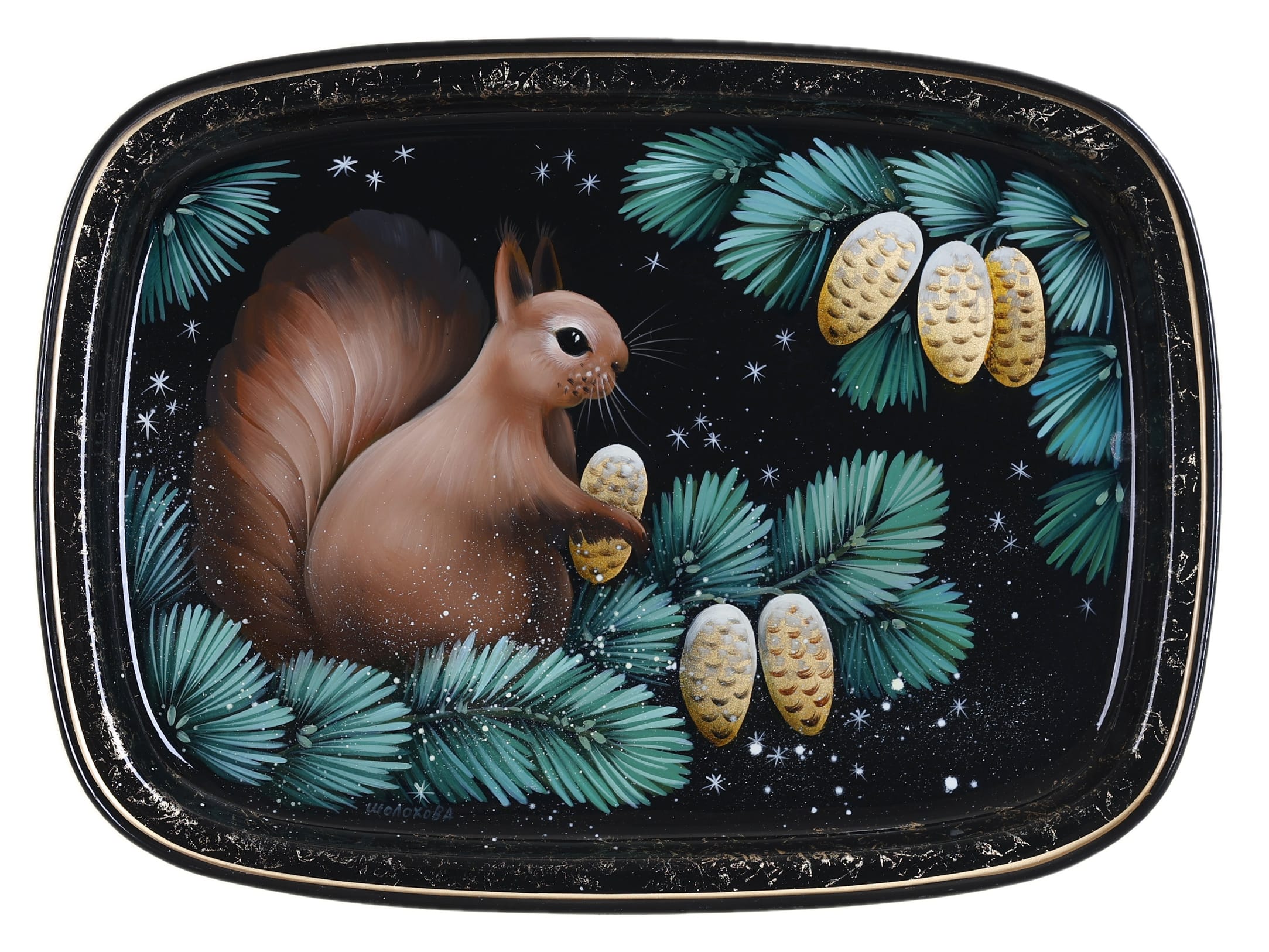 Жостовский поднос A12D02032697, Автор Шолохова Татьяна, Материал: Металл, Форма Прямоугольная, Фон Черный, Сюжет Анимализм, Размер 33х24 см, Вес 0.45 кг, В комплекте: Фирменный полиэтиленовый пакет, Производитель: Жостовская фабрика декоративной росписи