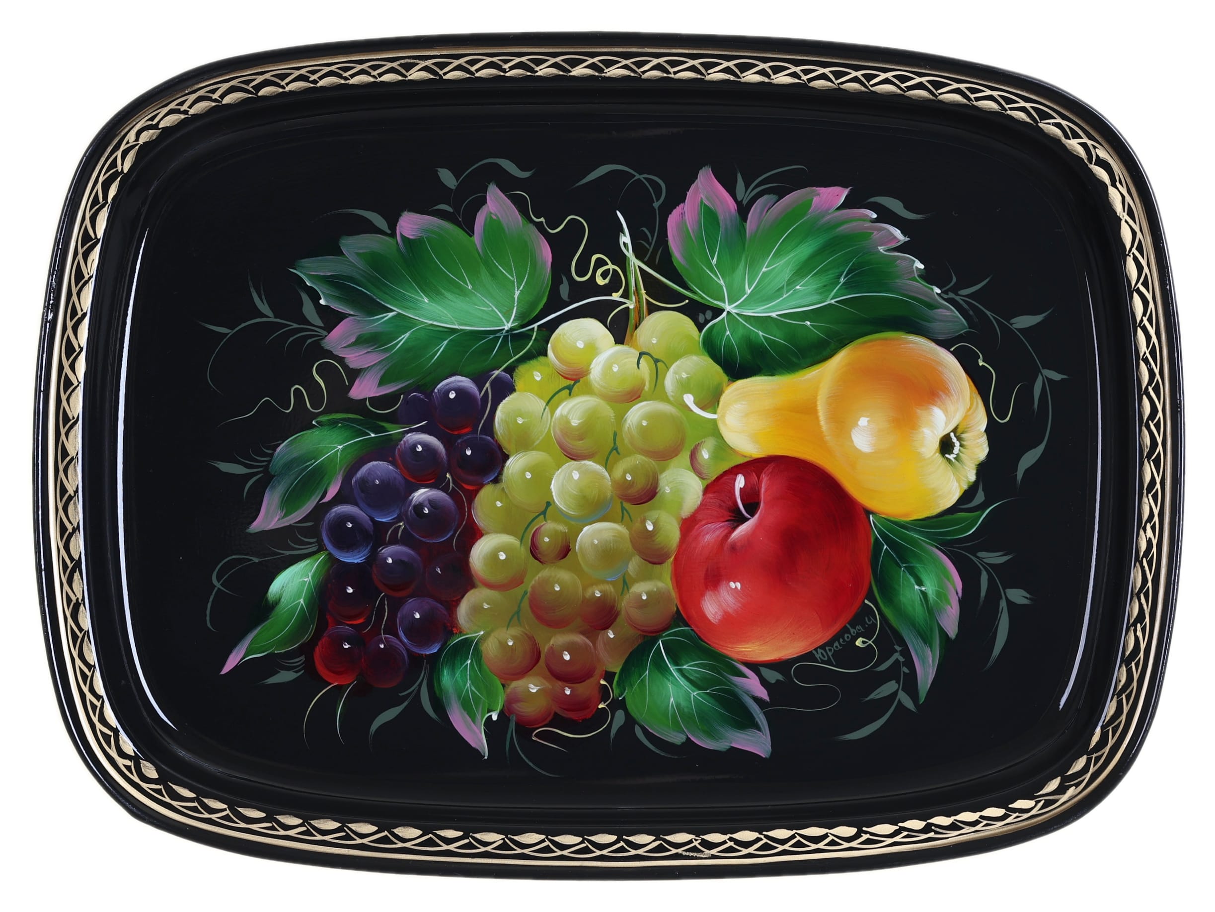 Жостовский поднос A12D020326126, Автор Юрасова Ирина, Материал: Металл, Форма Прямоугольная, Фон Черный, Сюжет Фрукты, Размер 33х24 см, Вес 0.45 кг, В комплекте: Фирменный полиэтиленовый пакет, Производитель: Жостовская фабрика декоративной росписи