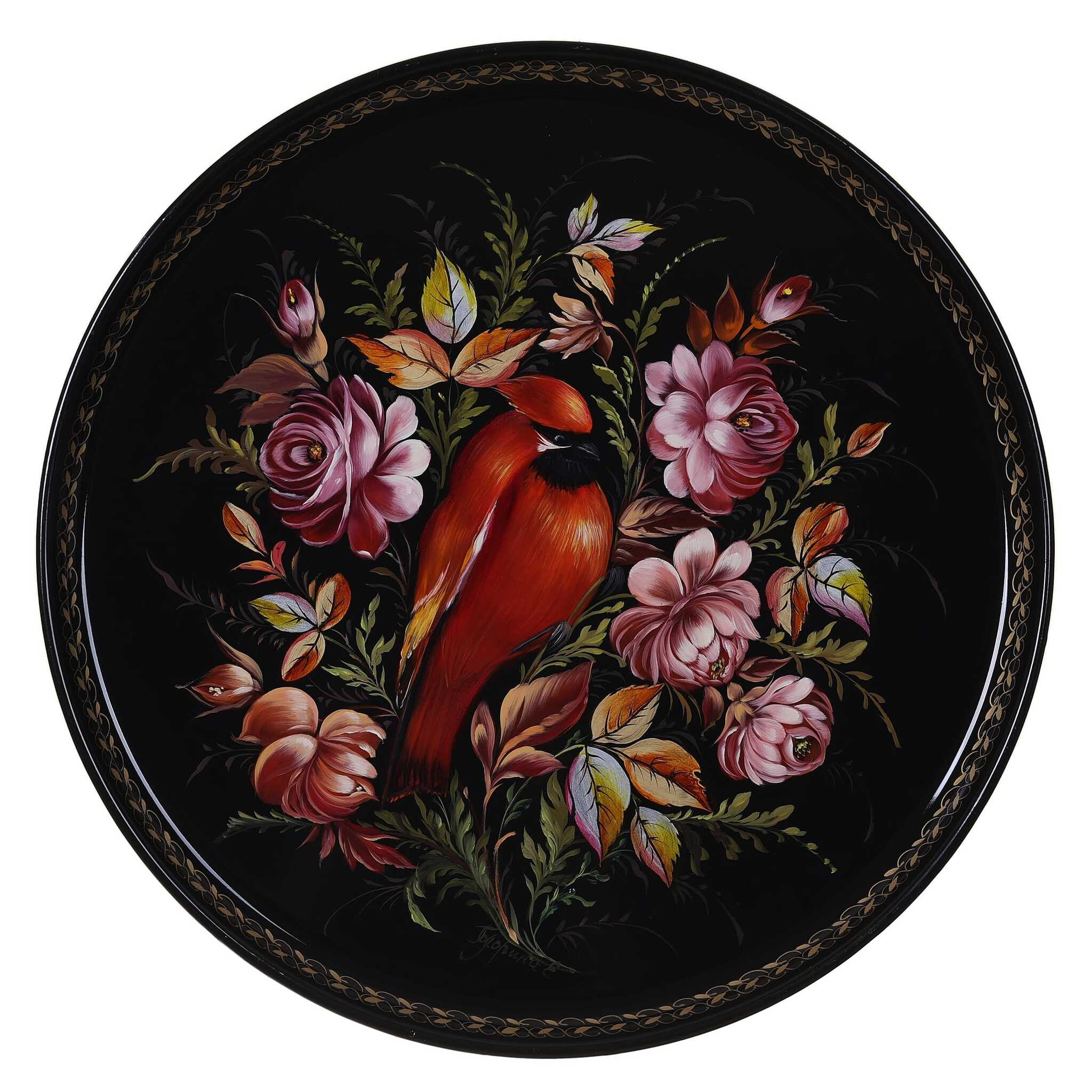 Жостовский поднос A14D17012550, Автор Головина Екатерина, Материал: Металл, Форма Круглая, Фон Черный, Сюжет Цветы##Птицы, Размер 37 см, Вес 0.76 кг, В комплекте: Фирменный полиэтиленовый пакет, Производитель: Жостовская фабрика декоративной росписи