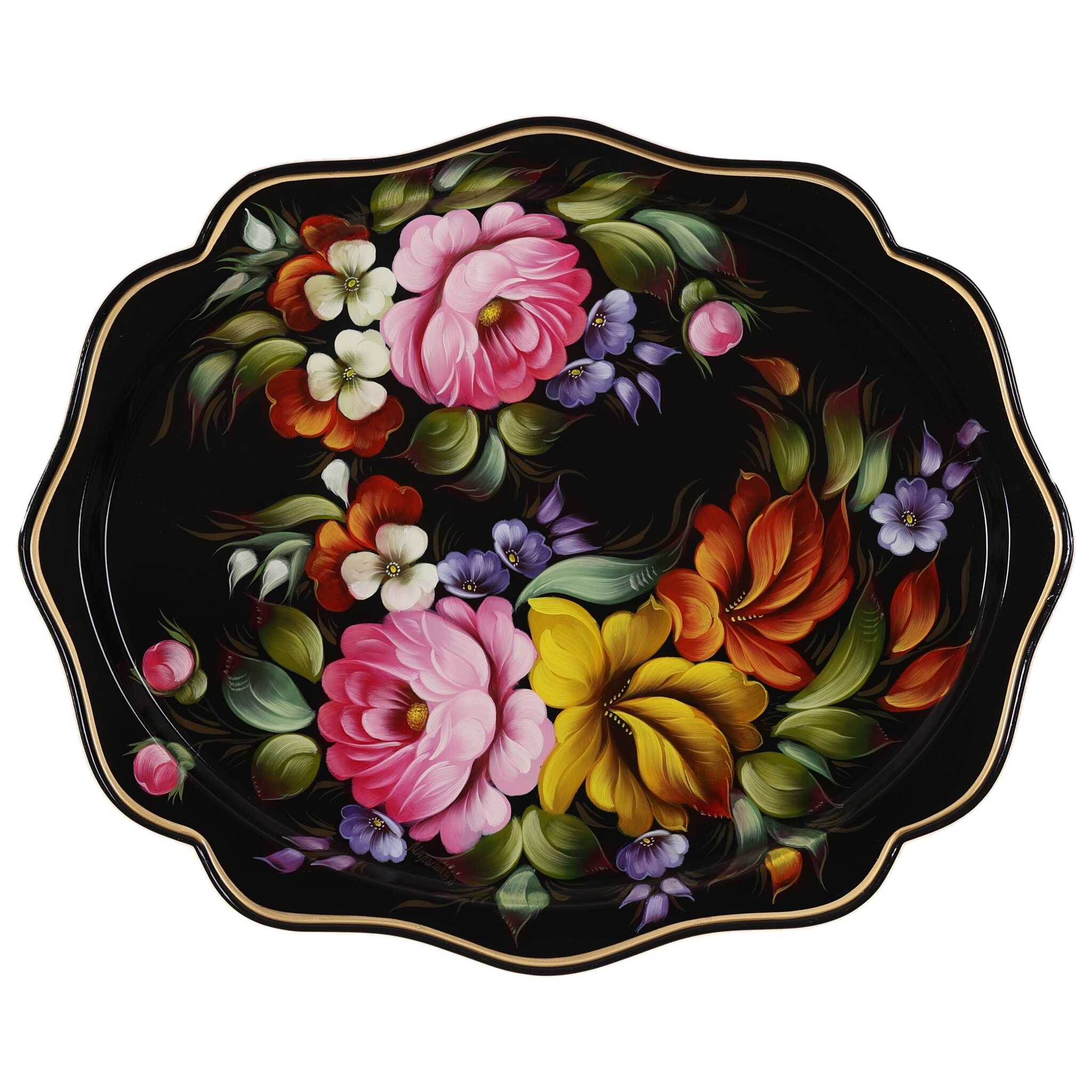 Жостовский поднос A15D28022569, Автор Малышева Мария, Материал: Металл, Форма Фигурная, Фон Черный, Сюжет Цветы, Размер 38х30 см, Вес 0.41 кг, В комплекте: Фирменный полиэтиленовый пакет, Производитель: Жостовская фабрика декоративной росписи
