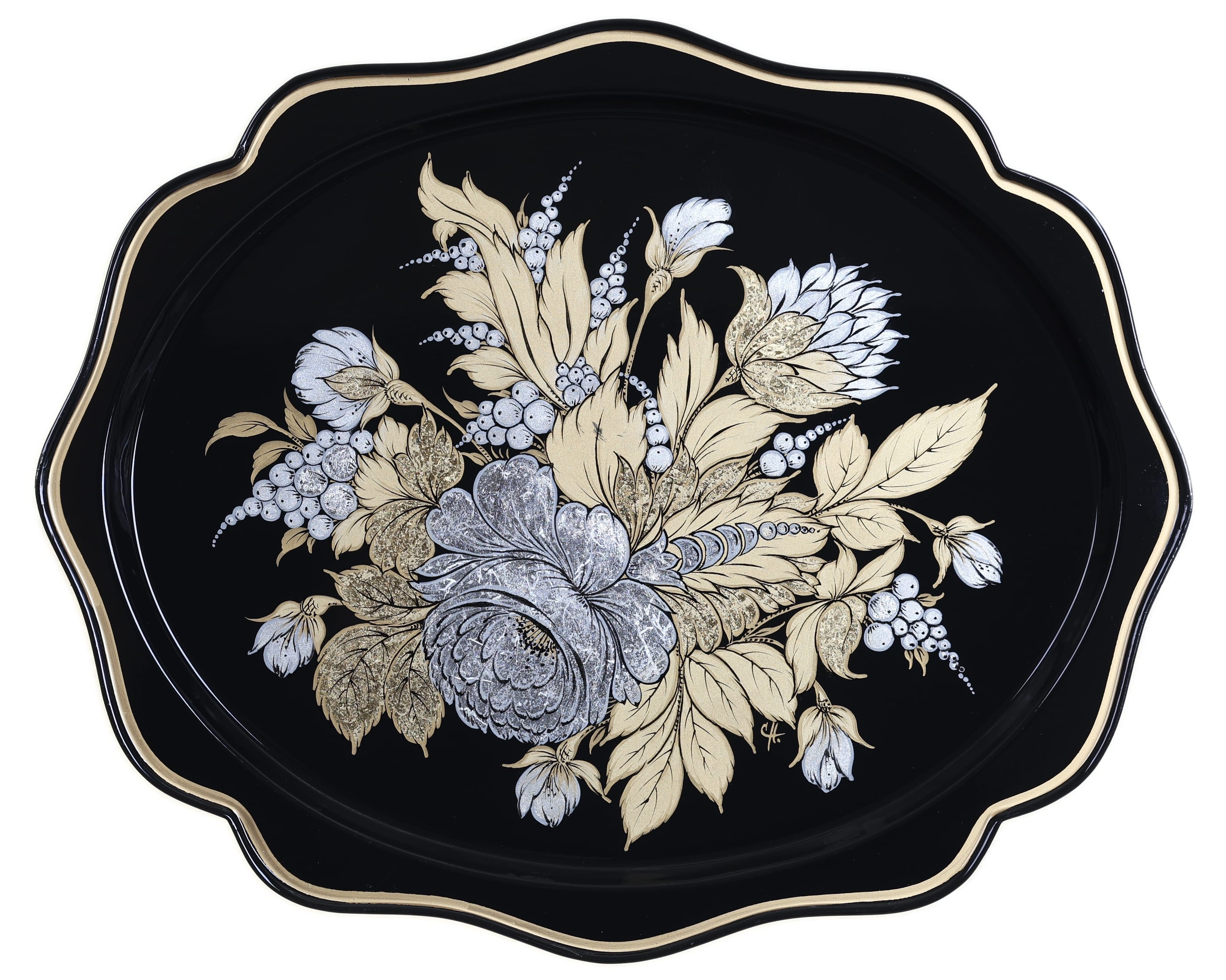 Жостовский поднос A15D29012634, Автор Соколова Наталья, Материал: Металл, Форма Фигурная, Фон Черный, Сюжет Цветы, Размер 38х30 см, Вес 0.41 кг, В комплекте: Фирменный полиэтиленовый пакет, Производитель: Жостовская фабрика декоративной росписи