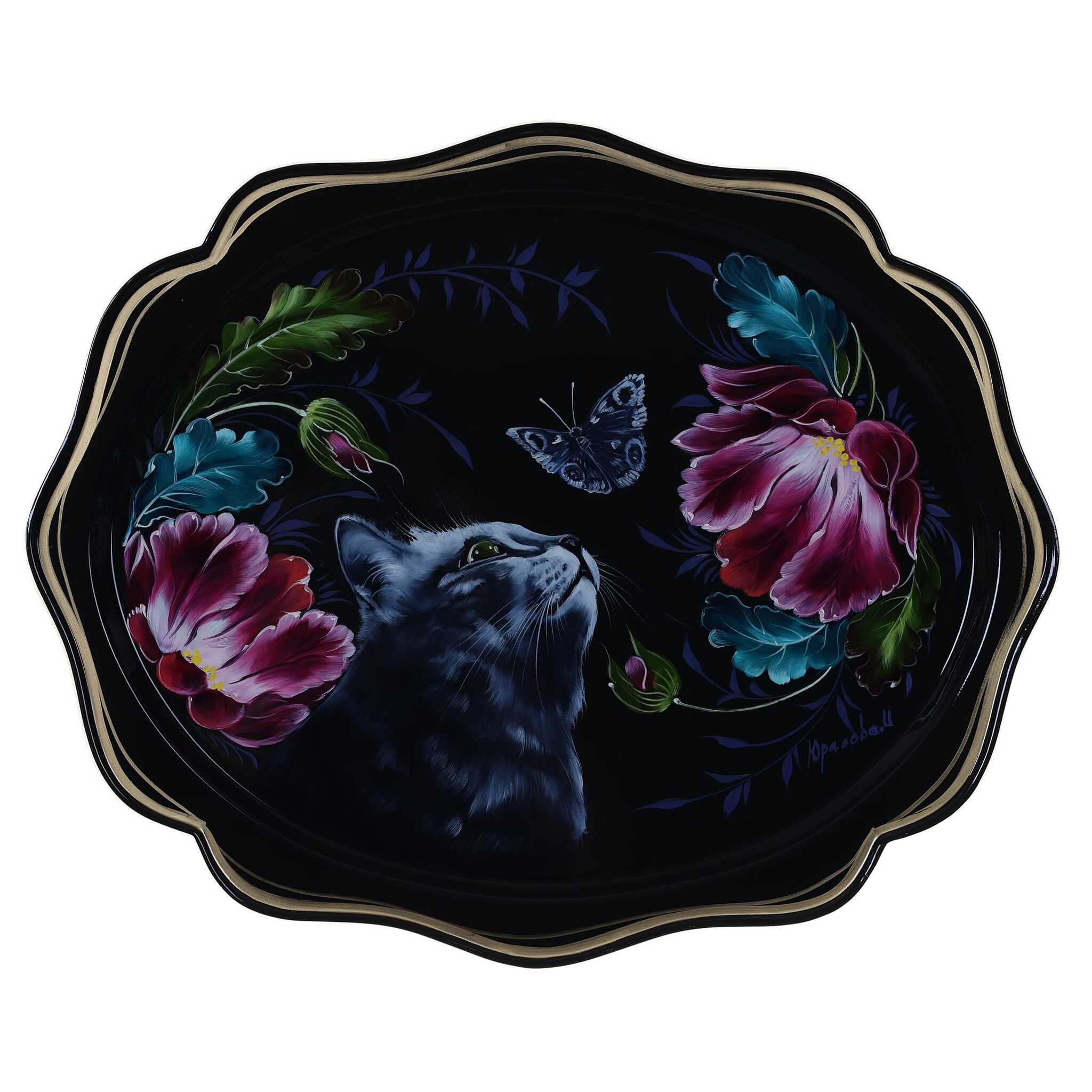 Жостовский поднос A15D17012531, Автор Юрасова Ирина, Материал: Металл, Форма Фигурная, Фон Черный, Сюжет Анимализм, Размер 38х30 см, Вес 0.41 кг, В комплекте: Фирменный полиэтиленовый пакет, Производитель: Жостовская фабрика декоративной росписи