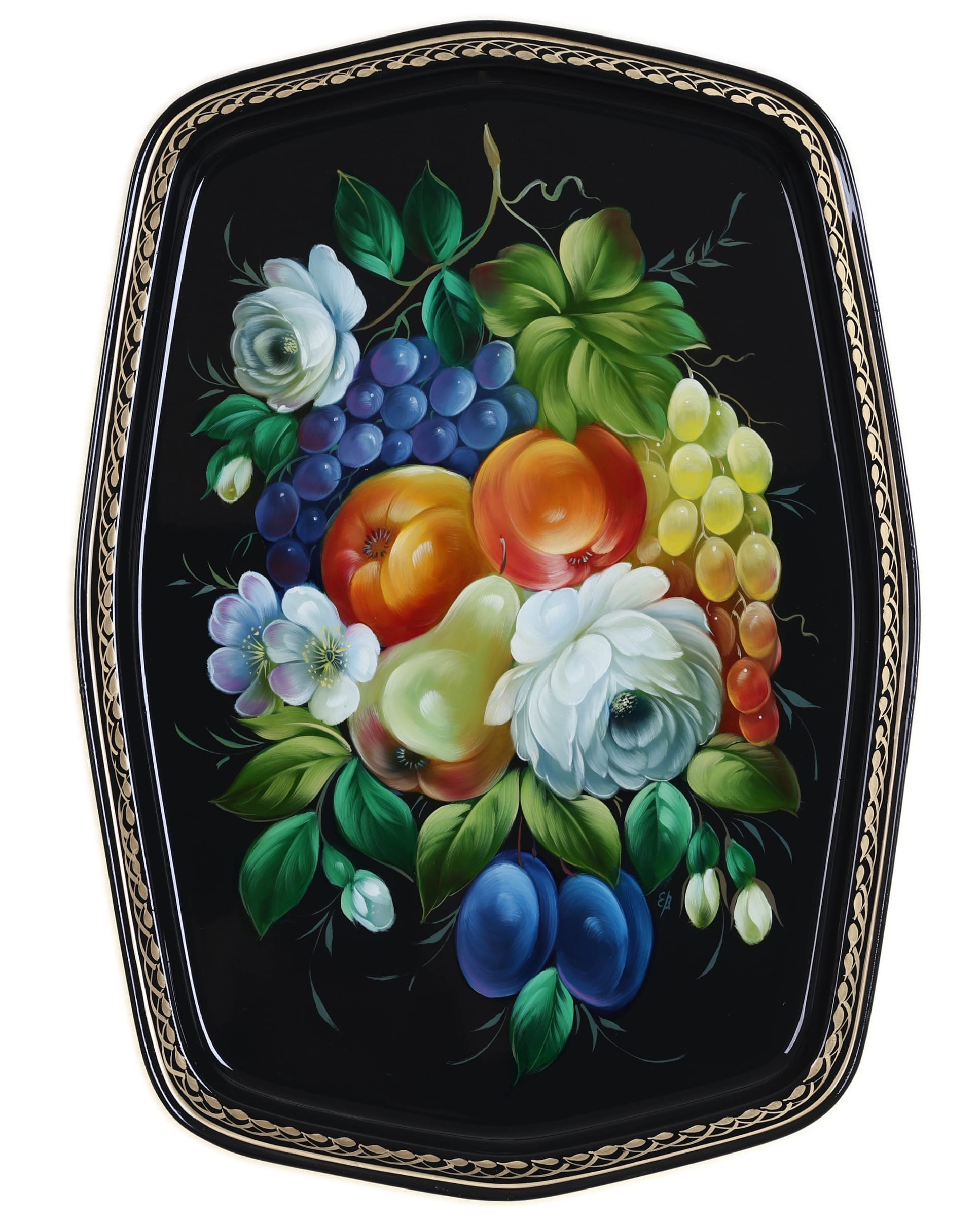 Жостовский поднос A18D020326218, Автор Васильева Екатерина, Материал: Металл, Форма Фигурная, Фон Черный, Сюжет Фрукты, Размер 45х32 см, Вес 0.8 кг, В комплекте: Фирменный полиэтиленовый пакет, Производитель: Жостовская фабрика декоративной росписи