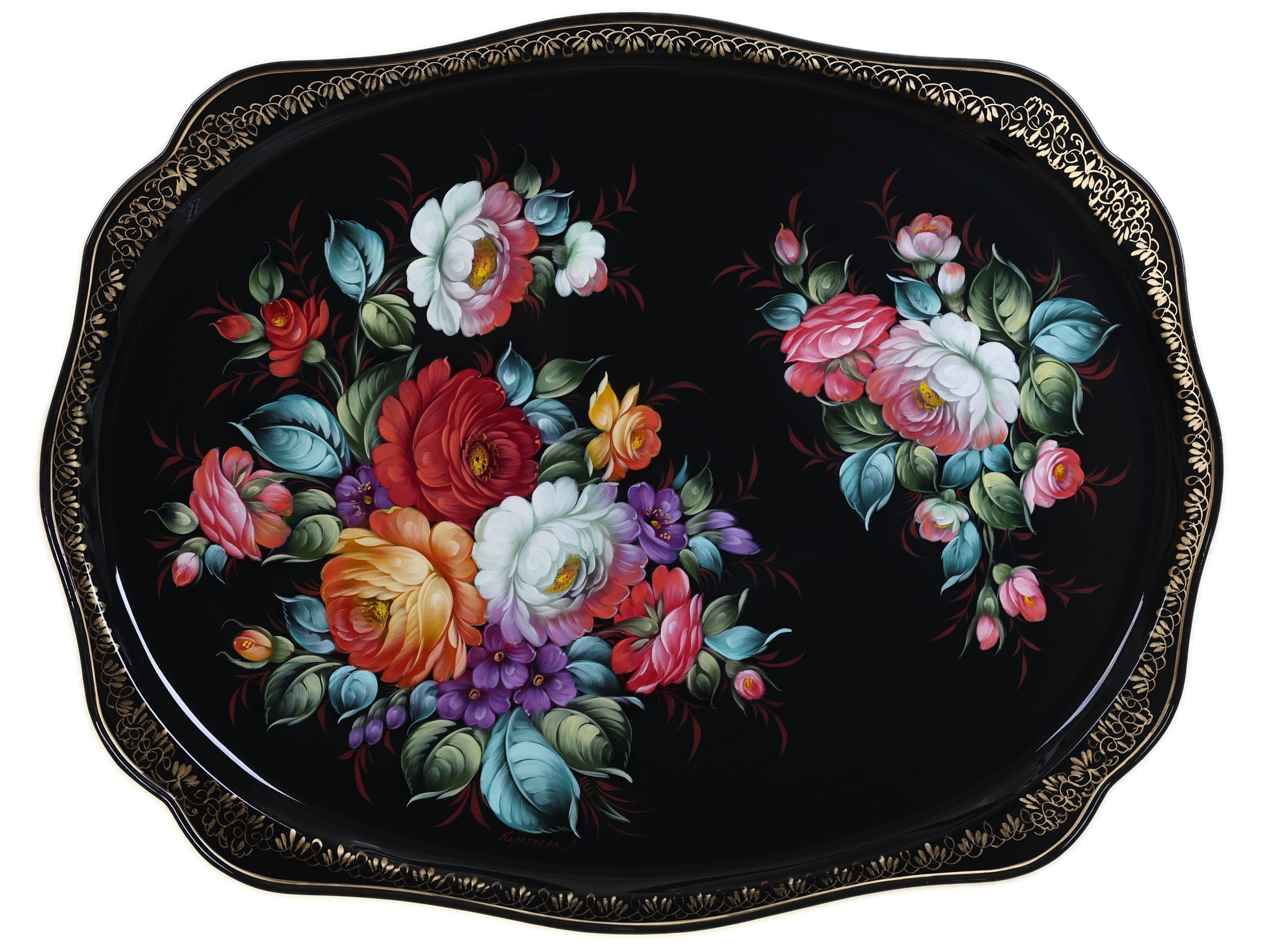 Жостовский поднос A31D2901264, Автор Коротеева Лариса, Материал: Металл, Форма Фигурная, Фон Черный, Сюжет Цветы, Размер 60х47 см, Вес 1.5 кг, В комплекте: Фирменный бумажный пакет, Производитель: Жостовская фабрика декоративной росписи